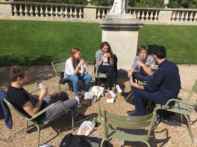 And speaking of the AF, these are Cam’s my (Cam is the only non-Davidson in my group) international friends–we grab food and eat lunch with them in the Luxembourg gardens after class (I genuinely can’t understand this, but most of the Davidson kids just eat in the cafeteria with other Davidson kids). From left to right we have the lovely Swiss (german speaking) couple Tobias and Steffii, the bawdy brits Becky and Adam, and Cam himself