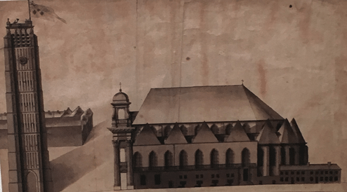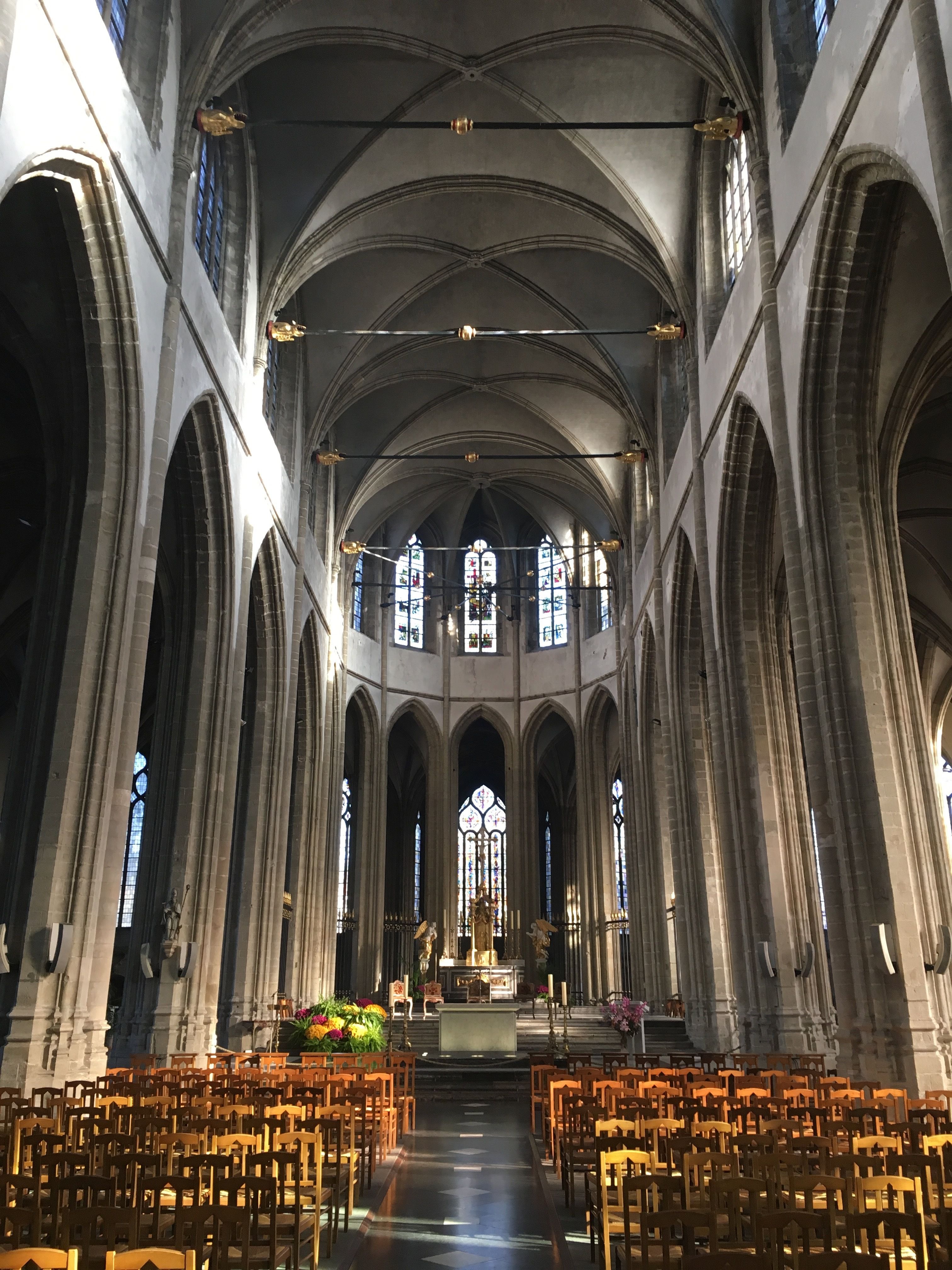 Destroyed in 1558 by the invading French, the hallekerk was replaced by a gothic-flamboyant church connected to the original bell-tower over a public road between them. Unlike typical gothic churches, Saint-Eloi is not fortified by flying buttresses, but rather by metal rods visible in the interior.